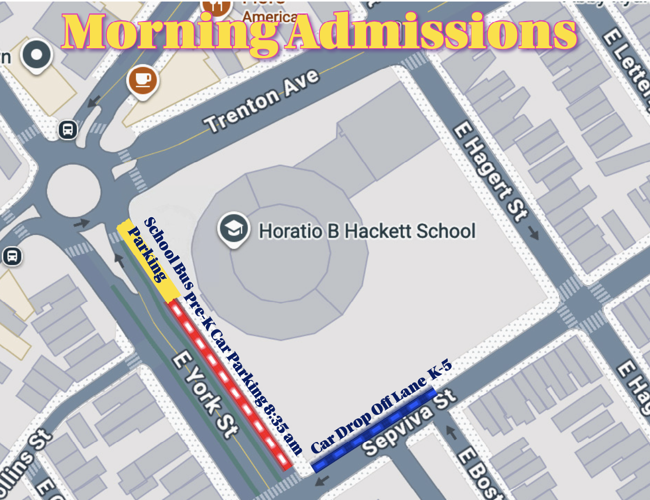 Pre-K Parents can park on York Street (Red line area): starting at 8:35am to enter the building and sign their children in to the classrooms.