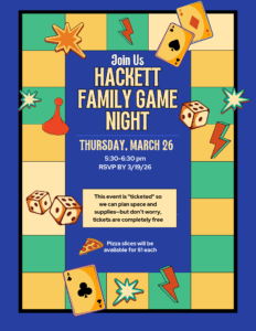 Join us in the Hackett Cafeteria as our school opens its doors for families to enjoy classic and creative board games, meet other members of our school community, and spend quality time at our school. Pizza slices will be available for $1 each. Whether you love strategy games, quick card games, or something just plain silly, there will be something for everyone.