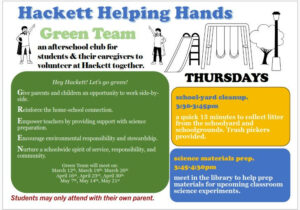 Hackett SAC is excited to introduce Hackett Helping Hands: Green Team : a once-weekly, kid-friendly hour of service where parents and caregivers lend a helping hand side-by-side with their student(s) and other Hackett families. The Green Team will meet on Thursdays from 3:30pm to 4:30pm, starting on Thursday, March 12th. Each student must be accompanied by their own parent or caregiver. Only current Hackett students may participate. We ask that younger siblings who are not yet in school please not attend.