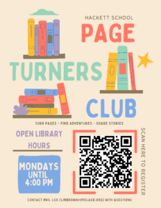 Join us for a relaxed afternoon in the school library! The Page Turners Club invites students in grades K-5 to stay after school each Monday to explore new arrivals, participate in our monthly Book Character Scavenger Hunt, or simply find a beanbag and read with friends. It’s the perfect, quiet transition from the school day to home. We will only be able to accommodate 12 students each week, and students must be pre-registered for each session. To make sure everyone gets a fair shot at joining us, please register no more than 2 weeks in advance. We kindly ask that you wait until then to sign up; this helps ensure spots don’t go to waste if schedules change last minute!