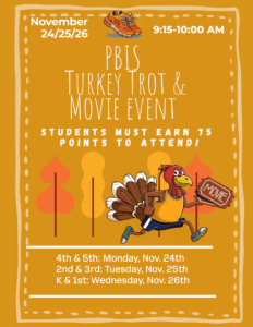 Get ready to wobble! This November, students who earn 75 PBIS points or more will be invited to participate in our ultimate thankfulness celebration: the Turkey Trot and Movie Reward!