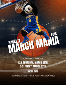 This month’s event is March Mania. This basketball-themed celebration will feature Hot Shot, a dribble relay, coloring pages, and more. Students will use PBIS points to purchase this event for 75 points.